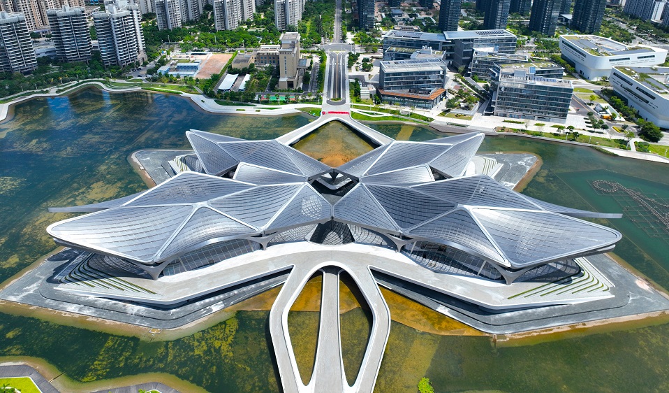 由中國三冶承建的珠海金灣市民藝術中心工程為國際著名建筑大師扎哈?哈迪德(Zaha Hadid)遺作。其單層鋼網格屋蓋呈“蝶形”,空間雙曲高低起伏、落差大、曲率多變,雙曲小截面箱型屋蓋次梁無一重樣,宛如蝴蝶浮于水面之上,又如鯤鵬展翅騰飛,極具建筑藝術美感,已成為珠海市新的城市文化地標、大灣區文化藝術交流的重要載體。